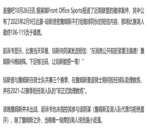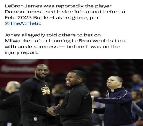 | 一条泄露勒布朗·詹姆斯伤情的短信,掀起了NBA近年来最大的赌球风暴,“在消息公开前赶紧重注雄鹿!詹姆斯今晚缺阵,下足够注码,让琼斯能捞一笔!”这是2023年2月9日早晨,前NBA球员达蒙·琼斯发给同伙的短信内容,当天晚上,湖人果然以106-115负于雄鹿,而詹姆斯确实未出战,这条直白而贪婪的短信,随着FBI近日公布的起诉书细节,将NBA隐秘的赌球暗流彻底暴露在公众面前