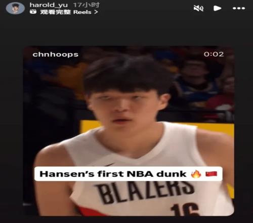 当杨瀚森完成NBA生涯第一次运动战得分,也是首个扣篮之后,正在西乙打球的余嘉豪转发了这个视频,没想到就在当天,他就打出了来到西乙之后的最强一战。 或许因为是同在国外,又或许都是大中锋的缘故,当杨瀚森完成NBA生涯首个扣篮的时候,余嘉豪赶紧进行了转发。