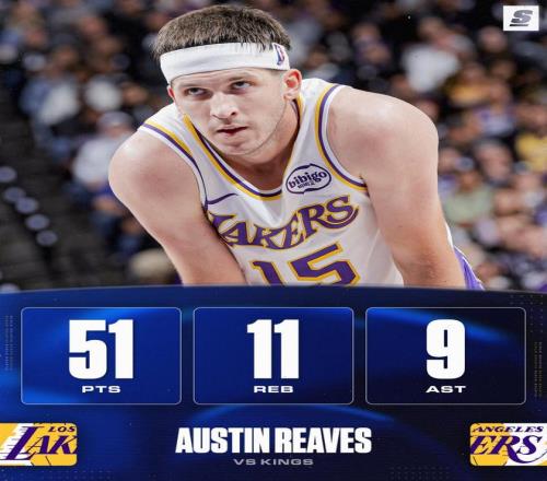 第6、里夫斯此战轰下了51分,这是NBA新赛季的第三次单场50+表现,此前亚历山大单场55分,戈登单场50分。 第7、在湖人队史上,埃尔金-贝勒9次至少50分10板5助,科比1次,现在里夫斯也有了一次。里夫斯就此成为了该项纪录上的湖人队史第3人。 第8、数据统计显示,这是里夫斯生涯第2个40+,上赛季他曾在对阵步行者的比赛中砍下45分。 第9、里夫斯的45分+场次(2次)在队史上已经和湖人队名宿张伯伦、贾巴尔一样了。 里夫斯生涯已经轰进500记三分球