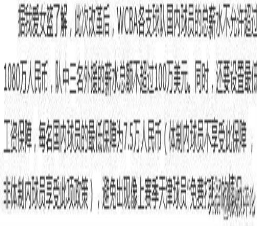 此次改革后,WCBA各支球队国内球员的总薪水不允许超过1080万人民币,队中三名外援的薪水总额不超过100万美元。同时,还要设置最低工资保障,每名国内球员的最低保障为7.5万人民币(体制内球员不享受此保障 ,非体制内球员享受此项政策),避免出现像上赛季天津球员“免费打球”的情况。