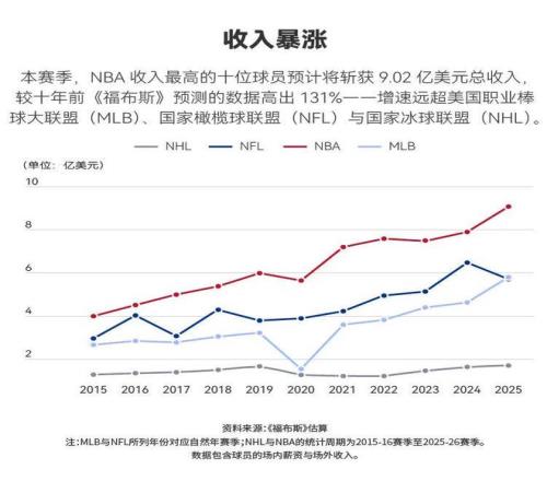 其中场外收入合计3.8亿美元,远超2022-23赛季创下的3.3亿美元历史峰值。以詹姆斯(预计8500万美元)、休斯敦火箭队凯文·杜兰特(5100万美元)、密尔沃基雄鹿队扬尼斯·阿德托昆博(4500万美元)和库里领衔的NBA收入前十球员,其场外收入总额远超其他体育联盟同行:美国职业棒球大联盟(MLB)前十球员的场外总收入为1.2亿美元、美国国家橄榄球联盟(NFL)为1.1亿美元、美国国家冰球联盟(NHL)为2700万美元,足球界全球收入前十球员的场外总收入为2.38亿美元、高尔夫球界为1.99亿美元、网球界为1.92亿美元。 赛场内收入同样增长显著。随着NBA营收飙升,联盟工资帽大幅提高。本赛季收入位居前十球员的薪资合计达5.22亿美元(未扣除经纪人佣金),是十年前(2015-16赛季)2.1亿美元的2.5倍。合同数据库Spotrac资料显示,2015-16赛季,科比·布莱恩特以2500万美元薪资成为联盟最高,而本赛季,将有75名球员的薪资达到或超过这一水平。(相比之下,NHL工资帽时代的最高纪录,是明尼苏达荒野队基里尔·卡普里佐夫签下的年均1700万美元合同。) 这一增长还未计入NBA即将迎来的巨额全国媒体转播收入。去年,NBA签下一份具里程碑意义的媒体转播合同,为期11年、价值760亿美元,本赛季正式生效。与旧合同相比,这份新合同平均每年将为各球队多带来约40亿美元收入,这也将推动工资帽继续上涨——下赛季工资帽预计将从本赛季的1.546亿美元升至1.655亿美元。 此外,库里在2026-27赛季的薪资达6260万美元,届时他将成为NBA首位薪资突破6000万美元的球员。对于这位似乎从不失手的球员来说,这又是一记漂亮的得分。 2025年NBA收入最高的十位球员