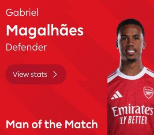 | 英超第10轮,阿森纳客场2-0击败伯恩利,此役送出1次助攻的阿森纳后卫加布里埃尔当选全场最佳球员。