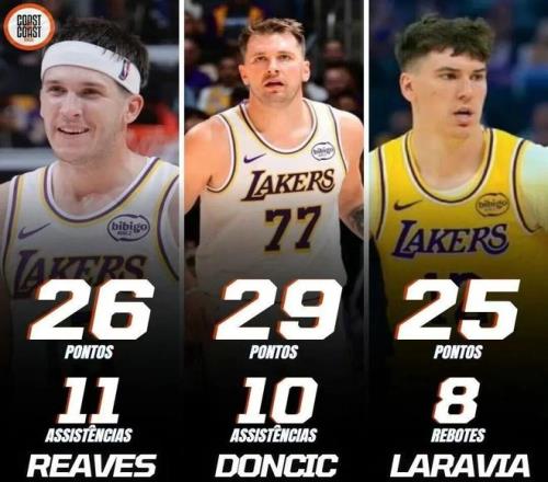 | 东契奇贡献29分11板10助三双,里夫斯26分11助两双到手,拉拉维亚25分进账,合计80分。 三个白人球员,撑起了湖人的现在,目前紫金军团以5胜2负高居西部第三。