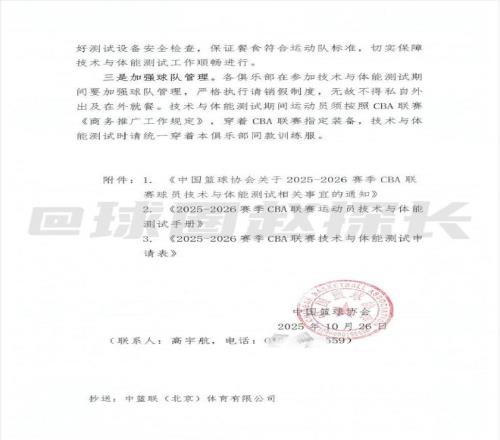 据探长了解,中国篮协已向CBA各俱乐部下发新赛季体测通知。
