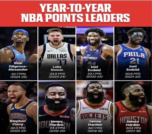 | NBA新赛季已经开始,每逢新赛季开始,关于“谁才是联盟最会得分的人?”的话题都会被重新提起。回望近16季的常规赛场均得分王,从杜兰特的青春登基,到哈登的高产时代,再到恩比德与东契奇的内外线统治,近年谢伊的崛起又把话题推高。下面这份年表按赛季逐一列出常规赛场均得分王,可作为我们判断新季风向与“得分话语权”流转的参照。 赛季:2009-2010杜兰特 (Kevin Durant) 国籍:美国 俱乐部:俄克拉荷马城雷霆 场均得分:30.1 年龄:21 赛季:2010-2011杜兰特 (Kevin Durant) 国籍:美国 俱乐部:俄克拉荷马城雷霆 场均得分:27.7 年龄:22