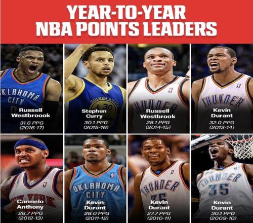 赛季:2016-2017威斯布鲁克 (Russell Westbrook) 国籍:美国 俱乐部:俄克拉荷马城雷霆 场均得分:31.6 年龄:28