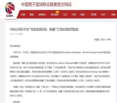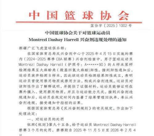 | 11月6日,篮协公布对上赛季新疆队外援哈雷尔的处罚,由于兴奋剂违规问题,哈雷尔被CBA处禁赛3个月,时间是2025年11月5日至2026年2月4日。球队方面,新疆队需要承担20例兴奋剂检测的费用36000元;对于新疆队的队医、医疗与反兴奋剂负责人吴杰警告处分。