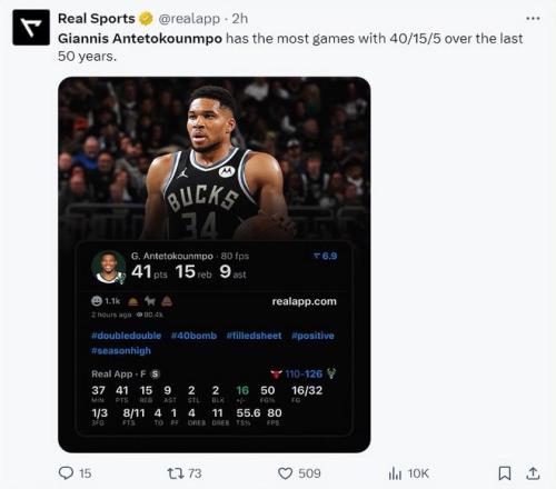 末节19分万夫莫敌!字母哥41+15又刷纪录美媒晒数据赞世界最强