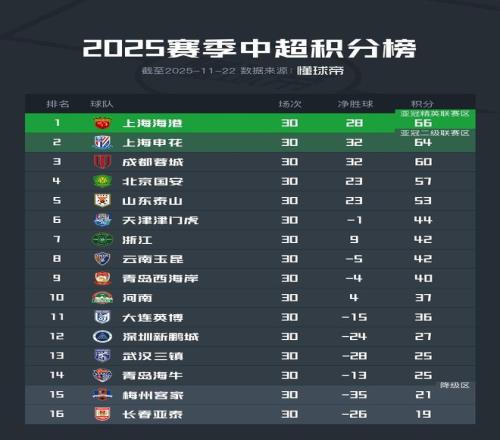 | 北京时间11月22日,2025赛季中超联赛迎来大结局。最终,上海海港夺冠,长春亚泰和梅州客家降级。
