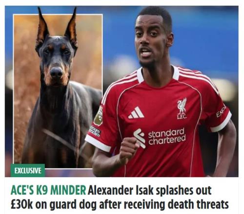 | 26岁的伊萨克,今年夏天从纽卡加盟利物浦,转会费高达1.45亿欧元(1.3亿英镑),是英超历史标王。11月22日,英国《太阳报》独家爆料,遭到死亡威胁的伊萨克,花3万英镑买下一只杜宾犬,守卫自己和家人的安全。