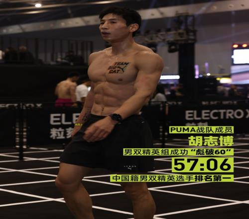HYROX风潮席卷国内,推动赛事水准持续跃升,中国选手的表现也因此不断突破。本站比赛中,彪马中国合作的HYROX运动员盛志康、陆鹏,以及彪马战队成员马东昊、胡志博,在男双精英组别中均于60分钟内完赛,成功「彪破60」。
