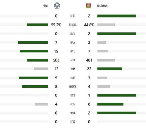 下半场瓜迪奥拉一口气换上了福登、奥赖利和多库,想要加强球队的进攻,不过第54分钟勒沃库森就给了主队沉重一击,身高1米91的大中锋希克,接到队友45°传中后,头球破门得分,帮助勒沃库森将领先的优势扩大到了2球。 第65分钟瓜迪奥拉再次做出换人调整,哈兰德和谢尔基披挂上阵,意味着蓝月军团要在主场发起最后的反扑,第71分钟哈兰德禁区内小角度打门被封堵,2分钟之后挪威魔人点球点附近的抽射又放了高射炮,连续浪费机会的曼城,只能眼睁睁看着勒沃库森从自己的主场带走了胜利。