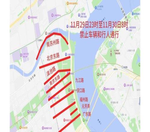 二、11月30日4时30分至8时,江西中路(延安东路—南苏州路)、四川中路(延安东路—南苏州路)、外白渡桥、乍浦路桥和四川路桥禁止车辆和行人通行。 三、11月30日4时30分至8时,中山东一路双向(外白渡桥—东门路)禁止车辆通行。