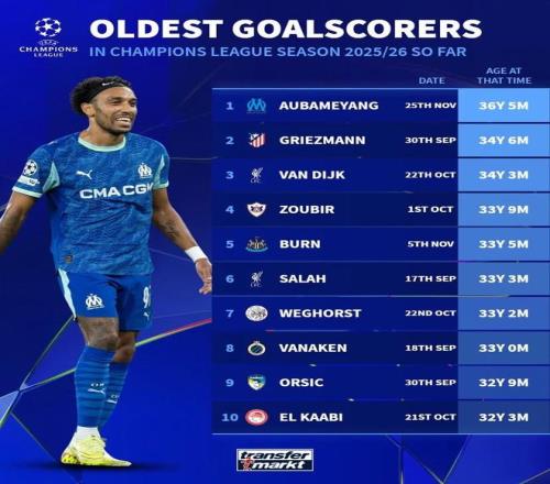 | 北京时间11月26日,在欧冠联赛阶段第5轮的比赛中,奥巴梅扬完成梅开二度,帮助马赛主场2-1逆转战胜纽卡斯尔联,赛后德转列出本赛季欧冠最年长的10位进球球员,奥巴梅扬以36岁5个月的年纪排名第一,格列兹曼第二,范戴克第三,萨拉赫第六。