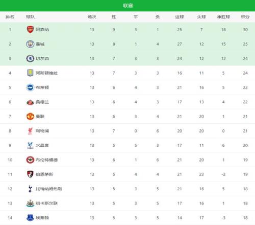 切尔西11阿森纳!利物浦20!英超最新积分榜维拉曼联逼近前三