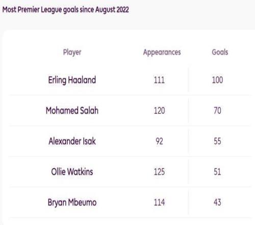 今年初,哈兰德与曼城续约9年半,如果这真的意味着他决心与蓝月长相守,那么,他打破并大大刷新纪录自然只是时间问题。倘若履行完2034年到期的合同,英媒测算他一共将收获389粒英超进球。 英超官网罗列了诸多与哈兰德有关的数据: ①2022年登陆英超以来,哈兰德进了100球,同期离他最近的萨拉赫只有70球,伊萨克55球就差得更远。