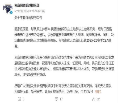 官宣!南京同曦队主教练下课,王世龙接任许利民直言外援太软