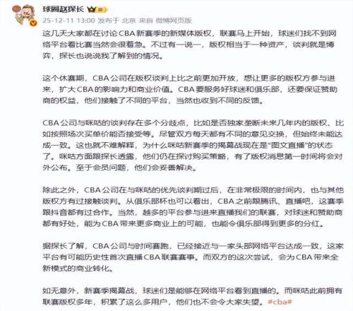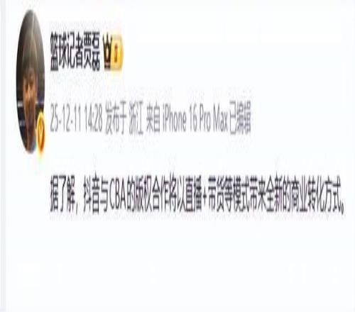 随后,球圈赵探长爆料称,某平台已经接触,准备直播。到了下午2点多,直播吧就给出了最新的消息,直言抖音已获得新赛季的CBA直播版权,将直播每轮部分场次的赛事。 随后,篮球记者贾磊老师给出了最新的报道,他表示,抖音与CBA的版权合作将以直播+带货等模式带来全新的商业转化方式。