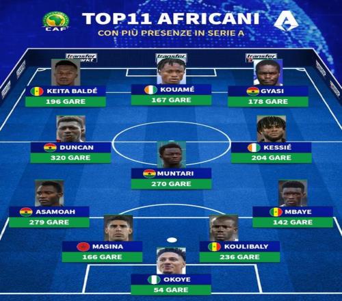 | 北京时间12月13日,德转列出了意甲联赛历史出场次数最多的非洲球员11人阵容,库利巴利、凯西、蒙塔里、阿萨莫阿以及凯塔-巴尔德在列。