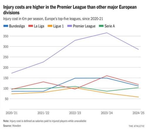| 近日,The Athletic发表了专题文章,深入分析了英超联赛近年来备受关注的球员伤病问题及其带来的巨额财务影响。文章援引Howden保险经纪公司最新发布的年度报告指出,过去五个赛季,球员伤病已给英超俱乐部造成超过10亿英镑的薪资损失。尽管伤病总体频率有所下降,但伤病的严重程度与经济成本却显著攀升,揭示了现代足球在赛程密度、战术强度与球员健康管理之间面临的复杂挑战,以下为专题文章。