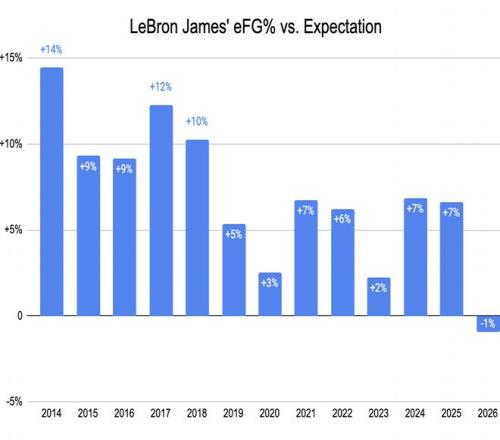 但在2025-26赛季,他的实际投篮效率首次略微低于预期值。
