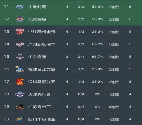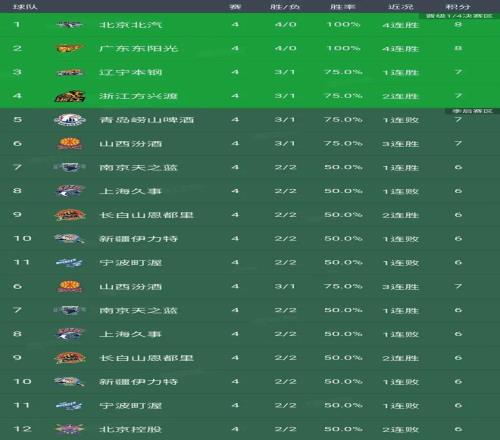 目前北京和广东4胜0负领跑全联盟,辽宁和广厦分列三四名,而天津、江苏和四川则是一生难求,0胜4负排在联盟最后三位。 |